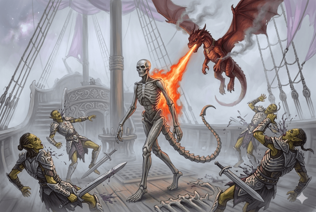 Embrath dropped from the masthead and breathed fire down its spine in a long red column. The fire did nothing. Bone Devils do not, as it transpires, mind fire. Embrath pulled up sharply, smoke streaming from her wings, and the Devil did not so much as glance at her — only dispatched Githyanki crewman after Githyanki crewman without breaking its unhurried stride.