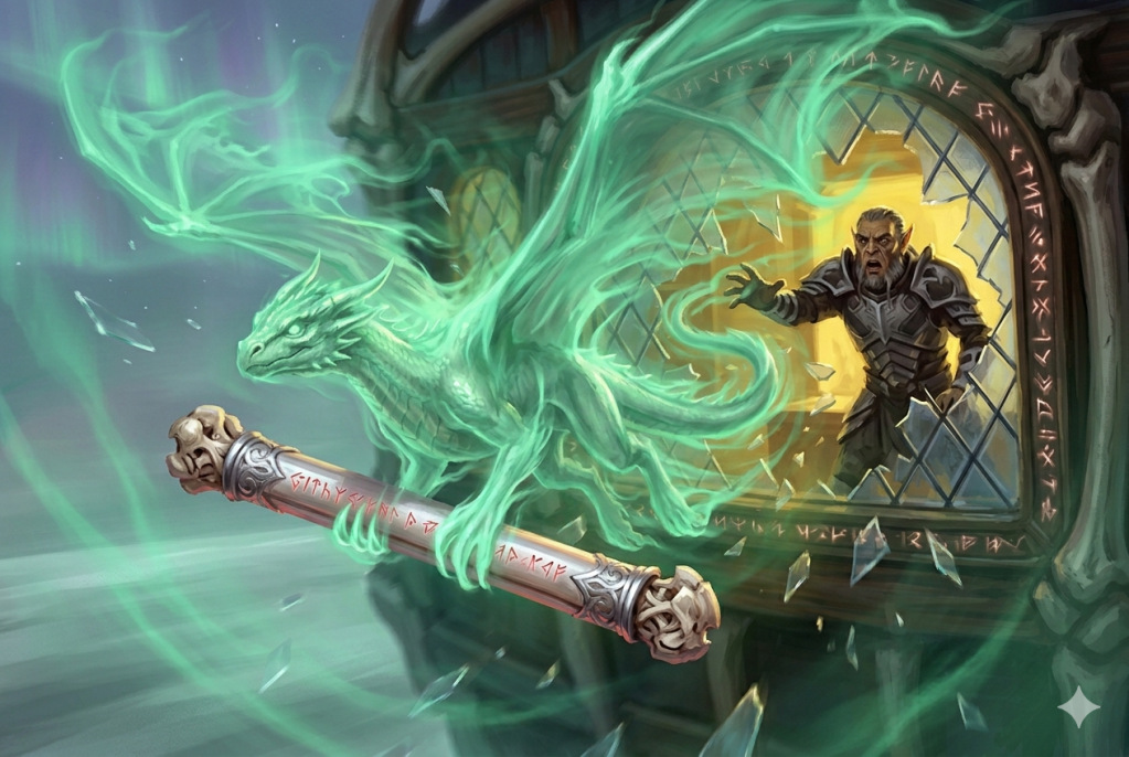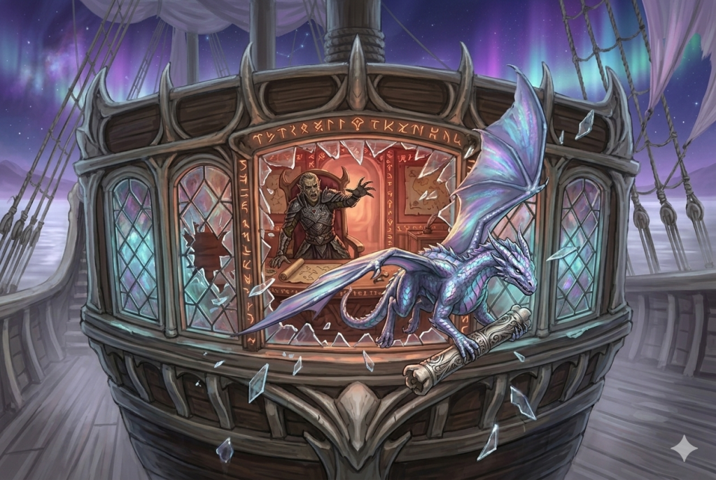 Kaymos clambered back onto the deck of the skiff — bruised, furious, and calculating. He got himself into a position above the broken windows where the Commodore could not quite see him without turning, and he sent Fizz through the gap. Fizz was small and Fizz was iridescent and Fizz was, increasingly, something more than a drake. He flew low through the cabin in a zigzag — between the Commodore’s elbow and the desk, under the lamp, around the back of the chair — and he came out the same window with the bone cylinder gripped in his foreclaws.